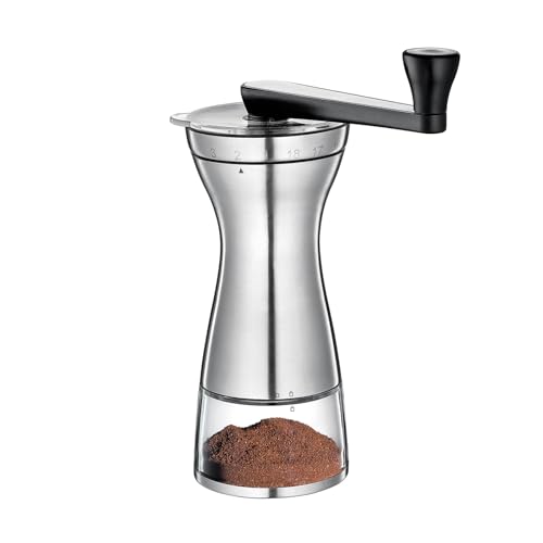 Small hopper capacity requiring frequent refills, slow manual grinding especially on fine settings, and the physical effort needed for larger brewing sessions.