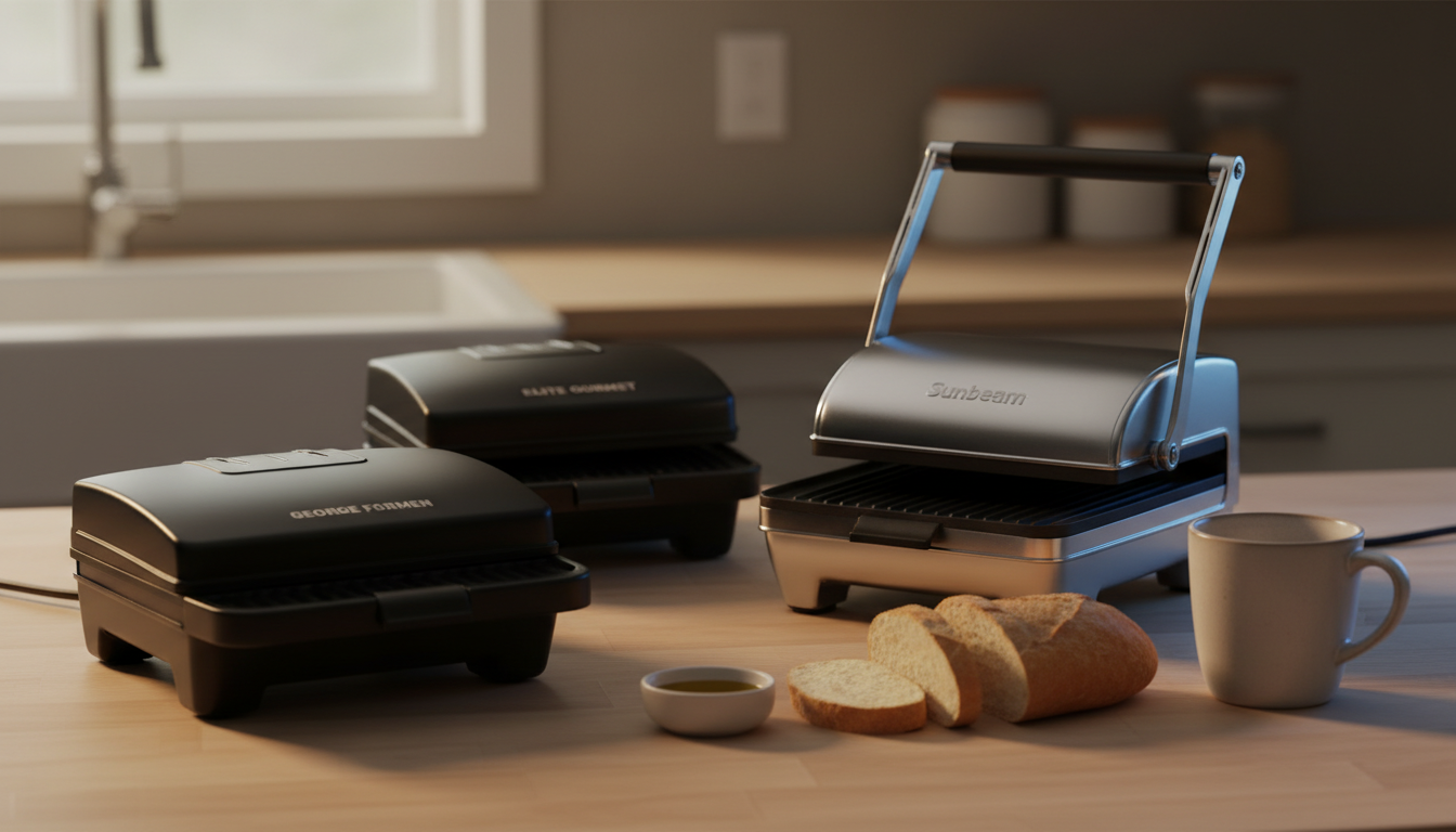 Professional reviewers highlight the grill’s ultra‑compact design, quick preheat, and effective fat‑draining sloped surface, noting its durability thanks to the Advanced George Tough coating. They appreciate the safety features like the cool‑touch handle but point out the fixed plates and modest power as drawbacks for heavier cooking tasks.