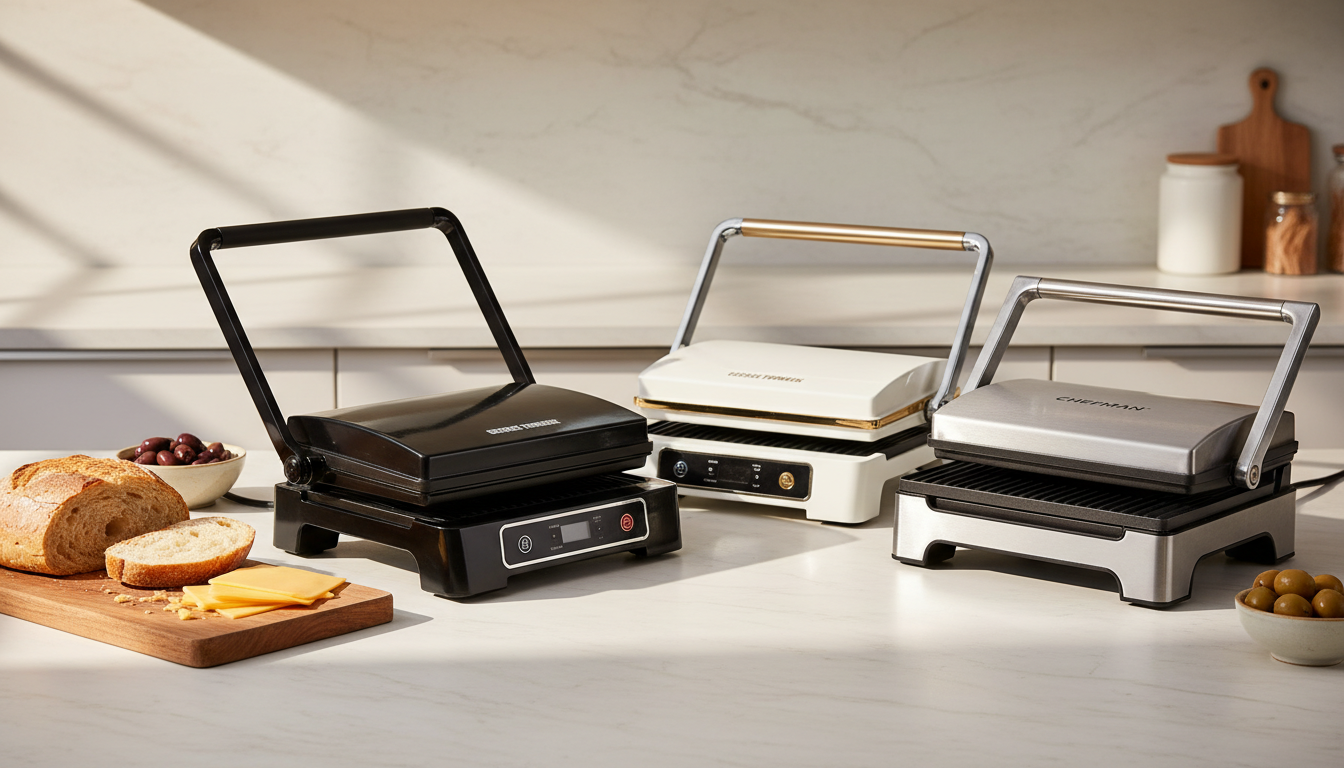 The Chefman 3‑in‑1 Panini Press Grill is a compact countertop appliance that functions as a panini press, contact grill, and flat open grill. It features nonstick 9 × 9.5‑inch plates, a floating hinge, and a 180° rotating design for versatile indoor cooking.