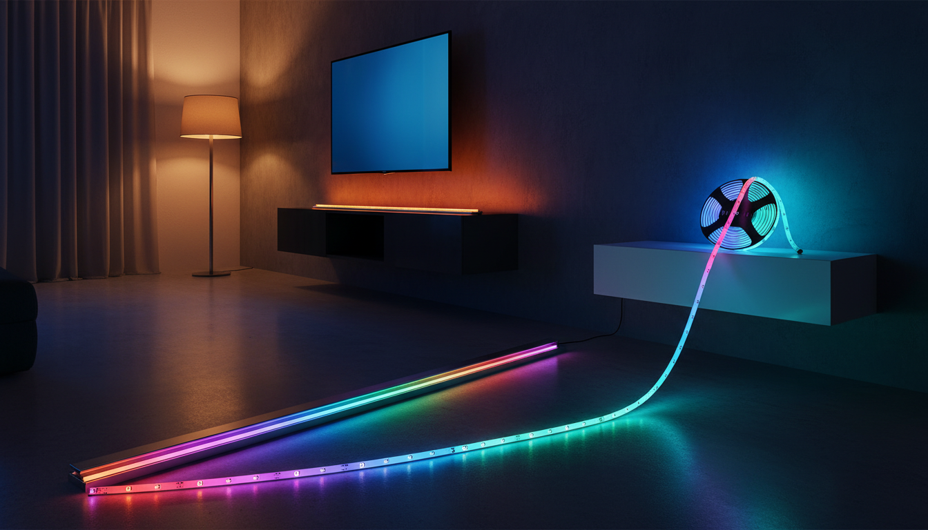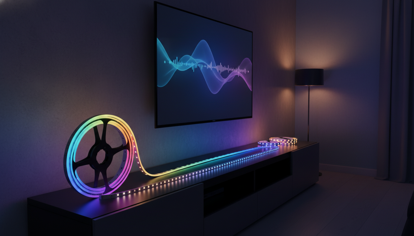 Govee offers RGBIC LED strip lights that are approximately 65.6 ft long, operate at a 24 V voltage, and use multicolor LED technology. The lights integrate with Alexa for voice‑controlled smart home operation and can be linked together—three 32.8 ft rolls can form a continuous 98.4 ft strip suitable for large outdoor installations.