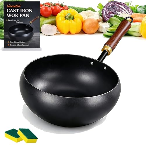 The Home VSS Pre‑Seasoned Cast Iron Wok 14.5" features a thick cast‑iron body with a flat bottom, pre‑seasoned PFAS‑free surface, and includes a wooden lid and spatula. It delivers even heat distribution and works on all stovetops, but its substantial weight can make handling challenging.