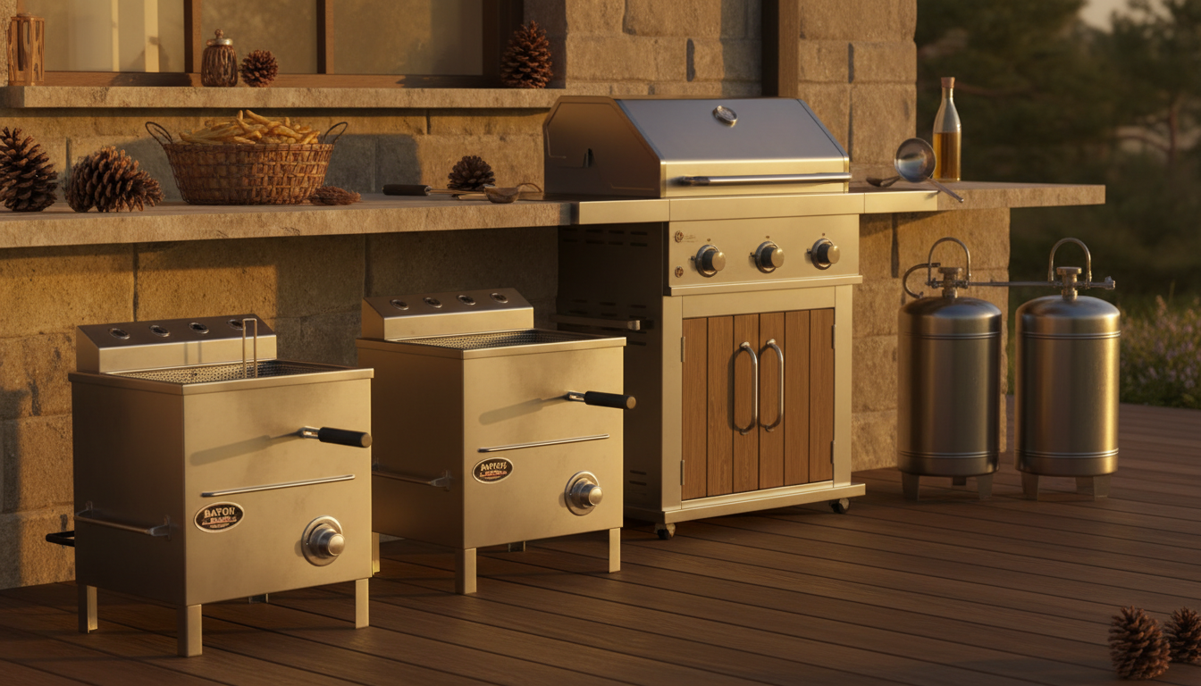 The Keekr KEEKR Two Tank Outdoor Deep Fryer is a propane‑powered, stainless‑steel fryer built for outdoor use, featuring two 16‑quart (4‑gal) tanks that let you fry large batches or different foods simultaneously. It includes front‑mounted thermometers, individual temperature knobs, and comes with two mesh baskets and lids, making it suited for events, camping, or backyard parties.