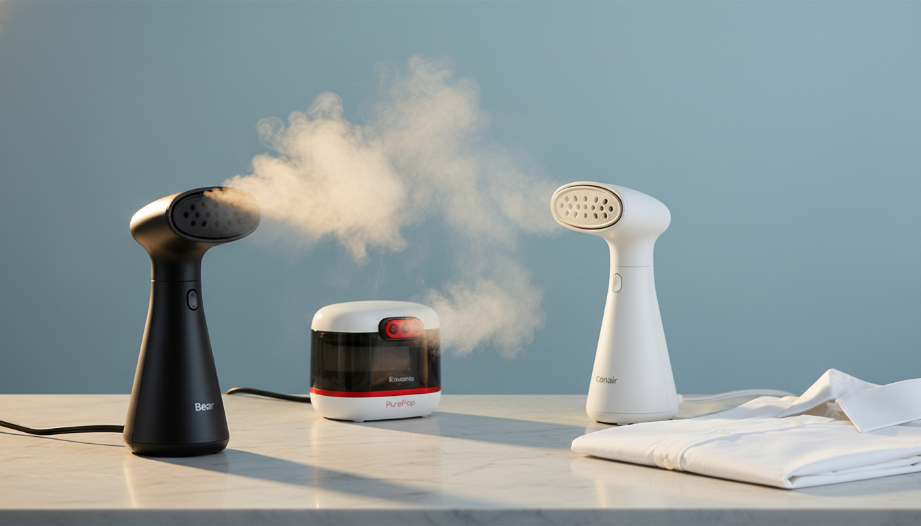 The Rowenta DR2020U1 Pure Pop Handheld Garment Steamer is a compact, travel‑ready device that heats up in 15 seconds and delivers 20 g/min of continuous steam for quick wrinkle removal, fabric refreshing, and sanitizing.
