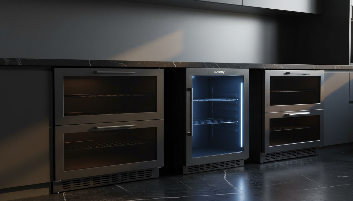 The Velieta KMYL145B is a 24‑inch under‑counter dual‑drawer beverage fridge with a 4.9 cu ft net capacity, weatherproof construction, and toughened glass shelves, designed for compact indoor or outdoor use.