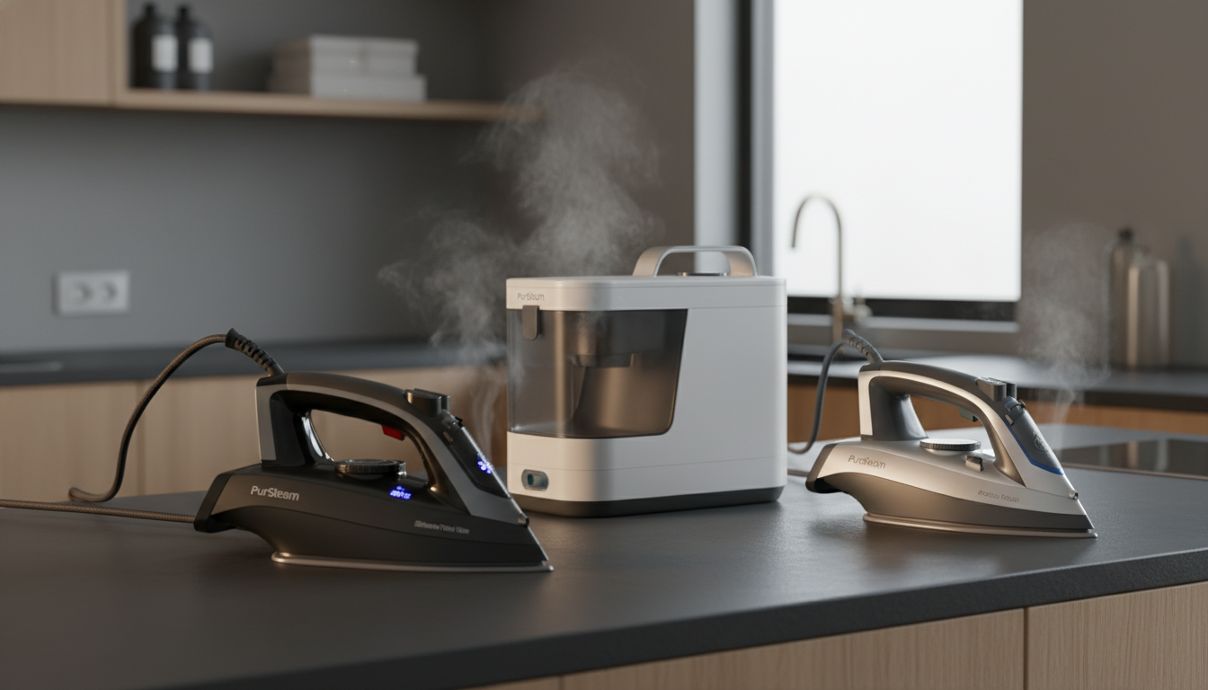 The Pursteam World's Best Steamers PUR0018 is a high‑power (1500W) steam station with a fast 1.5‑minute preheat, a large 50.7 oz removable water tank, and a ceramic soleplate that delivers strong continuous and burst steam for efficient wrinkle removal.