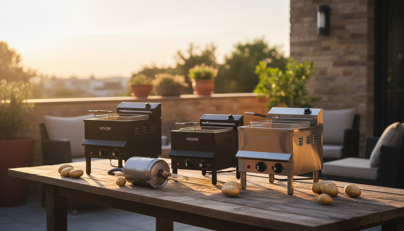 The Homira HM21 is a stainless‑steel, dual‑tank propane deep fryer for outdoor use, offering two independent 6‑quart fry pots, precise temperature control up to 400 °F, and high‑output 50,000 BTU burners for high‑volume cooking.